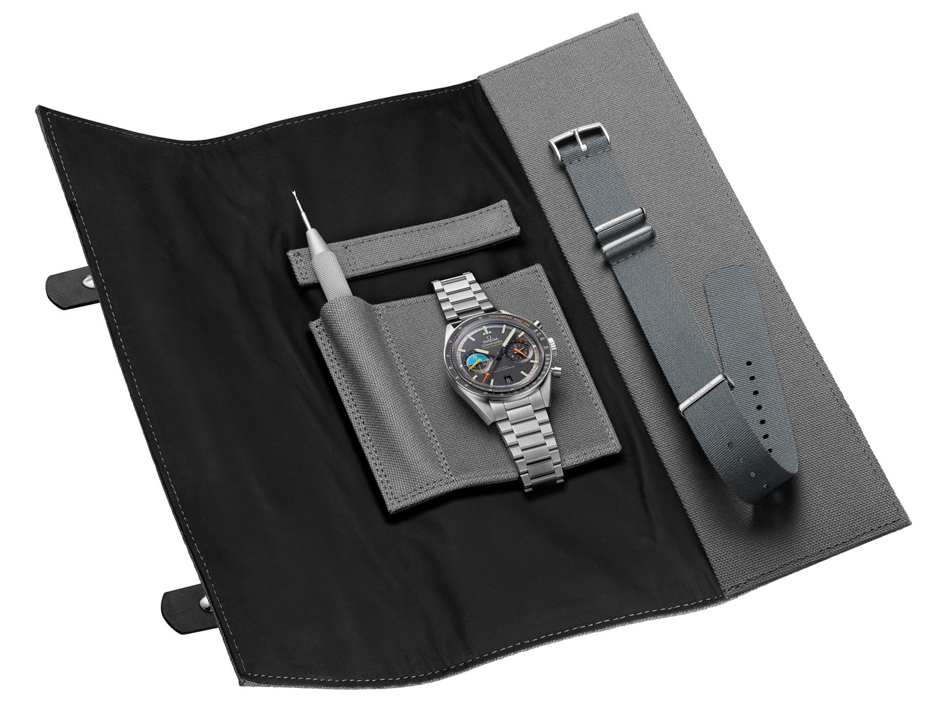 This Speedmaster Pilot has a brushed flat-links steel bracelet with OMEGA’s patented screw and pin system. Providing the power is OMEGA’s Co-Axial Master Chronometer Calibre 9900. The watch is presented in a special travel pouch with strap-changing tool and NATO strap made with KEVLAR® threads.